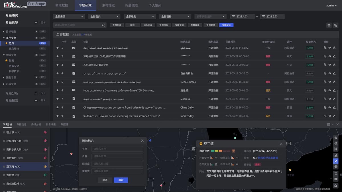以公正、客觀、獨立的中國視角對海外安全風(fēng)險形勢進行評估,通過聚合分析不同國別和區(qū)域安全風(fēng)險事件的要素信息,對我國駐外機構(gòu)、海外僑胞等提供實時安全風(fēng)險預(yù)警,減低安全風(fēng)險事件對我國重大工程造成的損失,提升海外人員的安全意識。