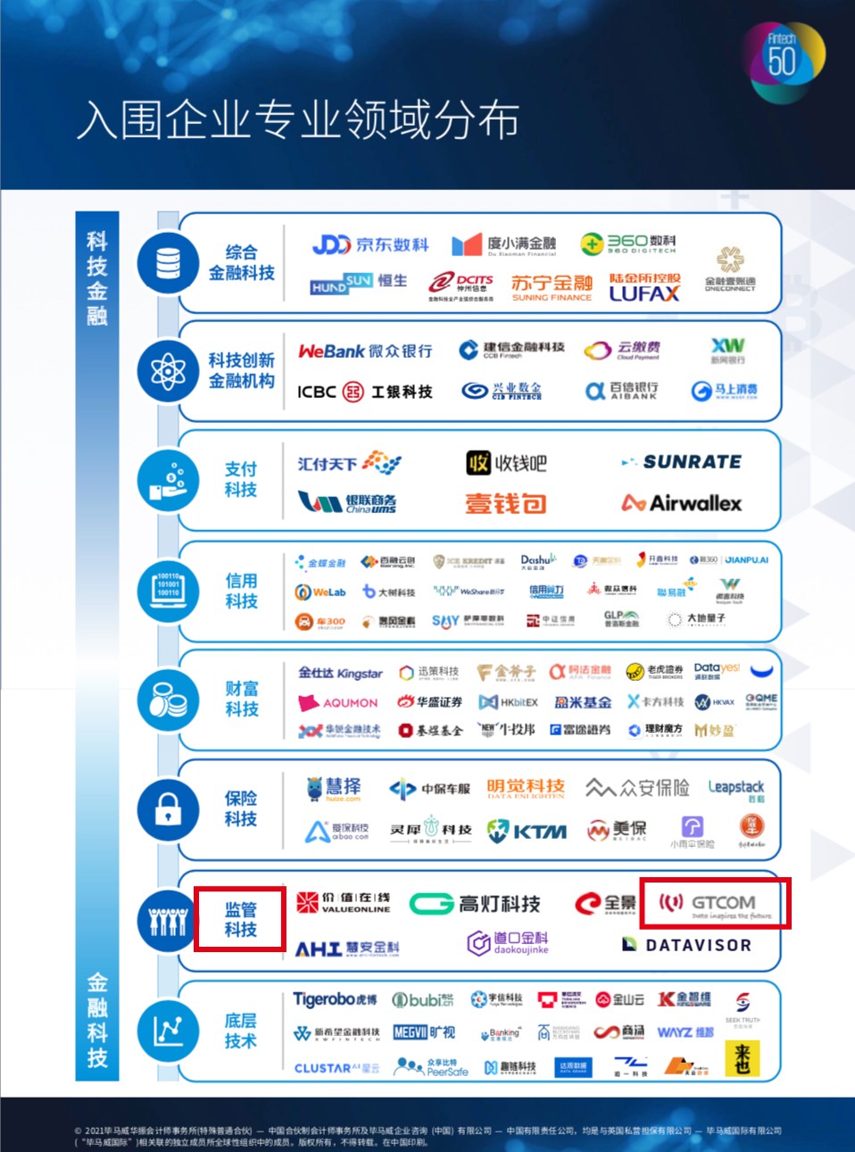 On January 18, 2021, the "2020 KPMG China Leading Fintech 50 and Report Release Conference" was held in Beijing. As a "regulatory technology" company in the Chinese fintech enterprise graph of KPMG China, Global Tone Communication Technology Co., Ltd., (GTCOM) was included in the list together with JD Digits, WeBank and ChinaUMS.